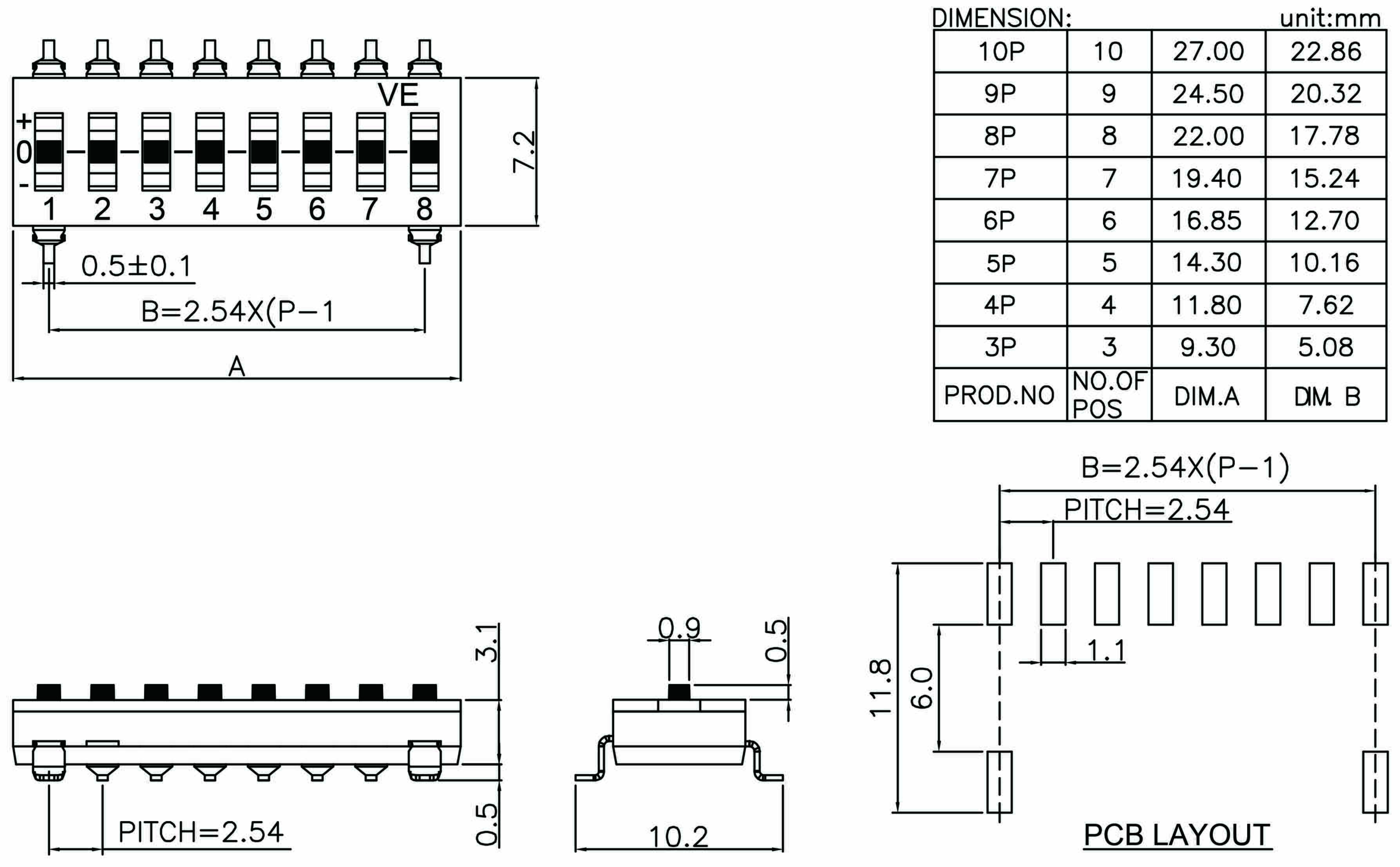 PVED Series (End-Stackable Piano Type Dip Switch)
